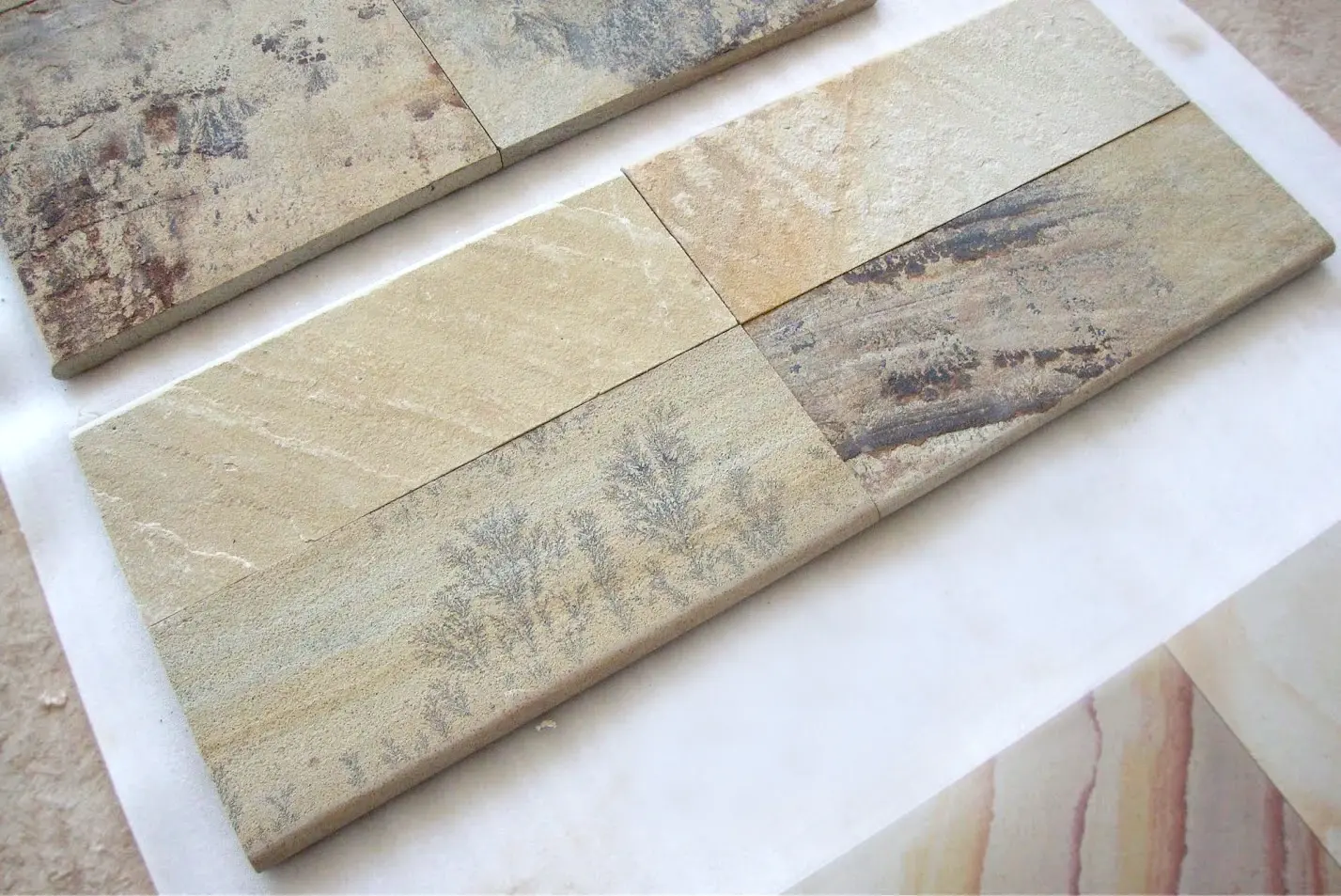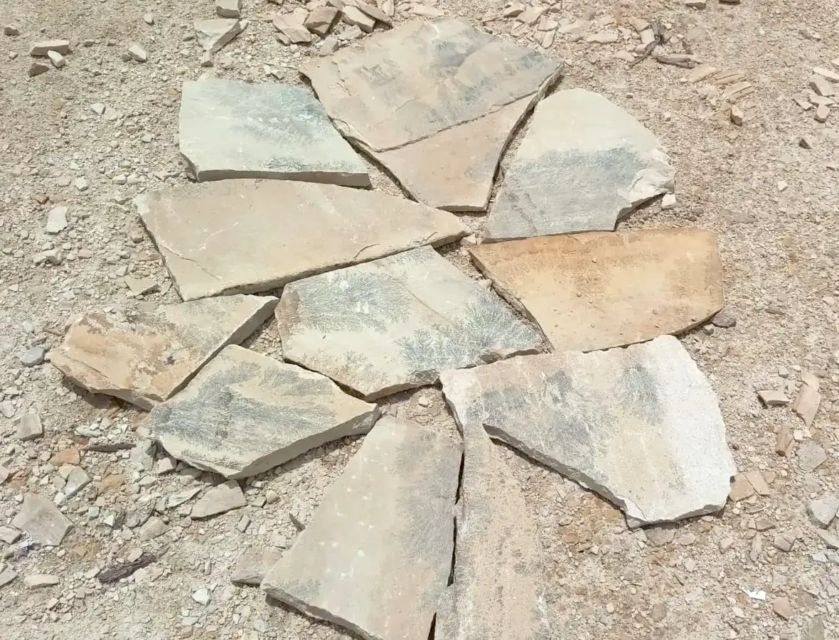 Fossil Mint Sandstone is a unique sandy buff stone characterized by beautiful, fern-like fossil patterns that naturally occur on its surface. While the base color is a warm minty cream, it is often complemented by blazing orange, rustic brown, and pink mineral deposits. This distinct appearance, combined with its strength and durability, makes it a favorite for patios, garden paths, and feature walls.